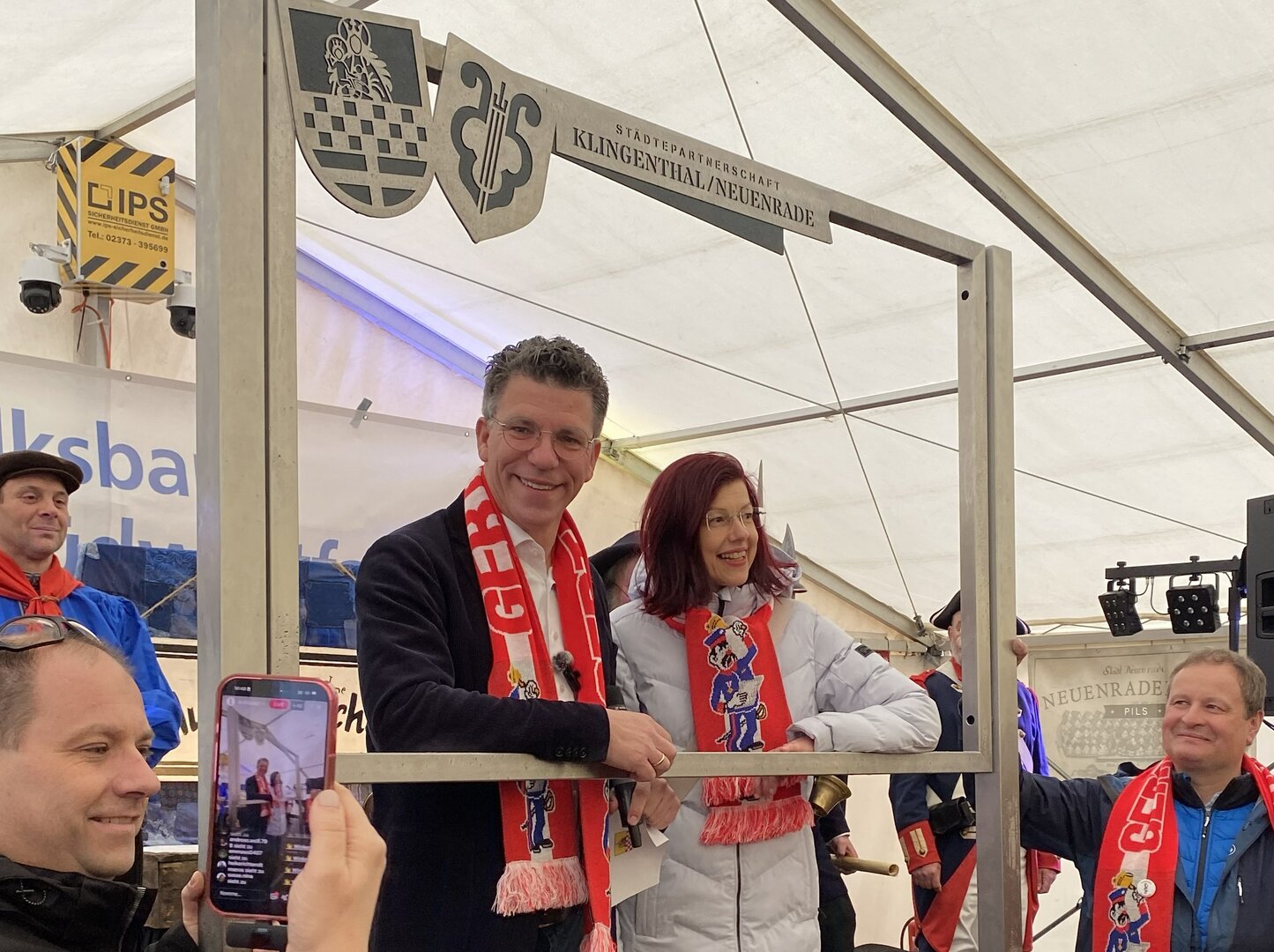 Zum 35-jährigen Jubiläum der Städtepartnerschaft hat die Stadt Klingenthal der Stadt Neuenrade einen begehbaren Fotorahmen geschenkt. Zur Gertrüdchen-Eröffnung hatte Oberbürgermeisterin Judith Sandner das Prachtstück, das von den beiden Stadtwappen und dem Schriftzug "Städtepartnerschaft Klingenthal/Neuenrade" geziert wird, im Gepäck. Die Stadt Neuenrade sucht nun den perfekten Platz für den Fotorahmen und bittet die Bevölkerung um Vorschläge.
