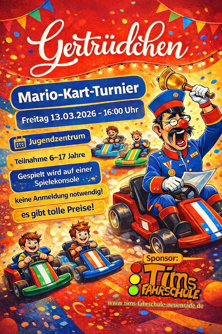 In Neuenrade heißt es am Gertrüdchen-Freitag: Anschnallen, Controller festhalten – fertig los! Das Jugendzentrum Neuenrade lädt für Freitag, 13. März, ab 16 Uhr zu einem rasanten Mario-Kart-Turnier in seine Räume an der Niederheide 1 ein. Kinder und Jugendliche zwischen sechs und 17 Jahren können ohne Anmeldung vorbeischauen und direkt ins Rennen starten.